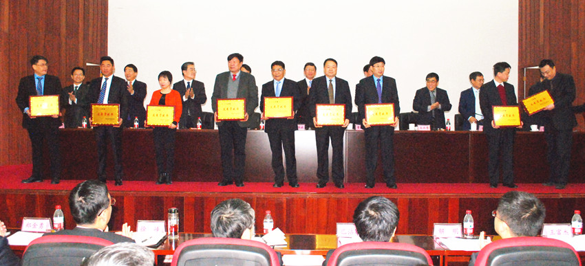 亨圆铜业公司董事长燕志富(左二)上台领奖